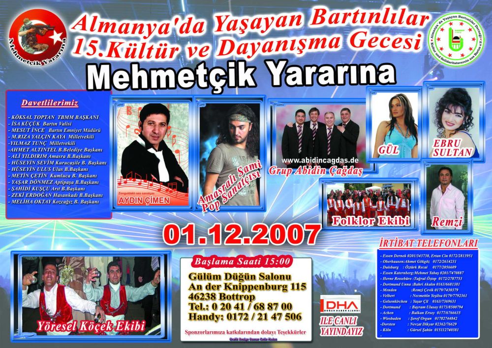 Almanyada Faaliyetlerini sürdüren kardeş derneklerimizden (ALBERDER) Almanyada Yaşayan Bartınlılar Derneği 15. Kültür ve Dayanışma gecesini 01.12.2007 Tarihinde Bottrop Gülüm Düğün salonunda gercekleştirecektir.