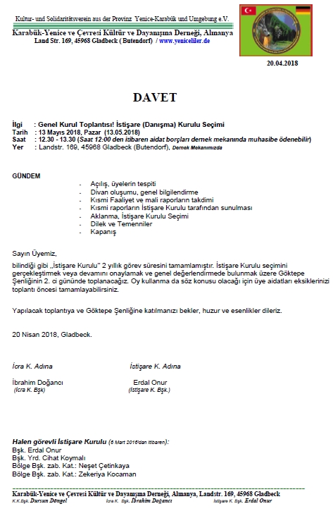 13 Mayıs 2018 pazar günü saat 12:30 - 14:30 arası Almanya`nın Gladbeck şehrindeki dernek lokalinde Yenice-Karabük ve Çevresi Kültür ve Dayanışma Derneği`nin olağan Genel Kurul toplantısı ve İstişare (Danışma/Denetim) Kurulu seçimleri gerçekleştirildi.