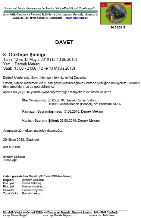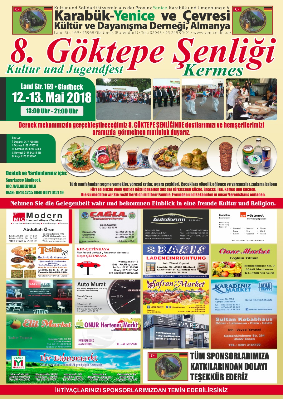 2018 Etkinlikleri Göktepe Şenliği: 12-13.05.2018, Dernek Mekanı İftar Yemeği: 26.05.2018, Hassel-Camisi Salonu, Gelsenkirchen Ramazan Bayramlaşması: 17.06.2018, Dernek Mekanı Kurban Bayramı Şöleni: 26.08.2018, Dernek Mekanı |