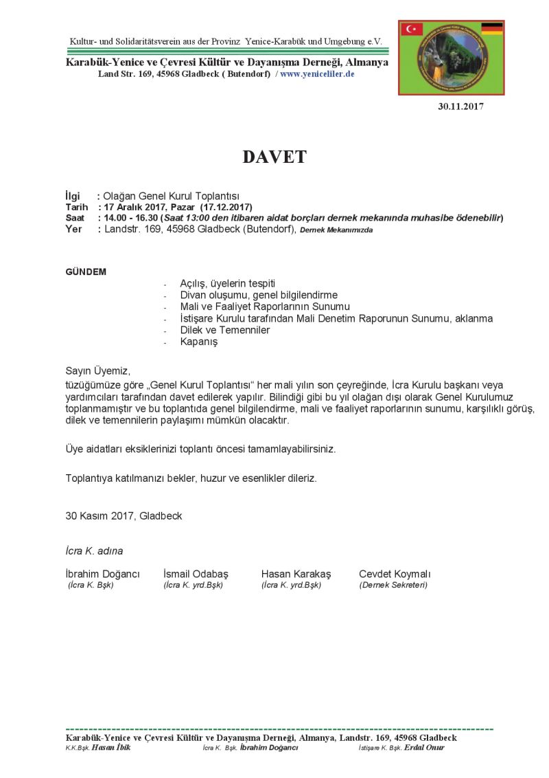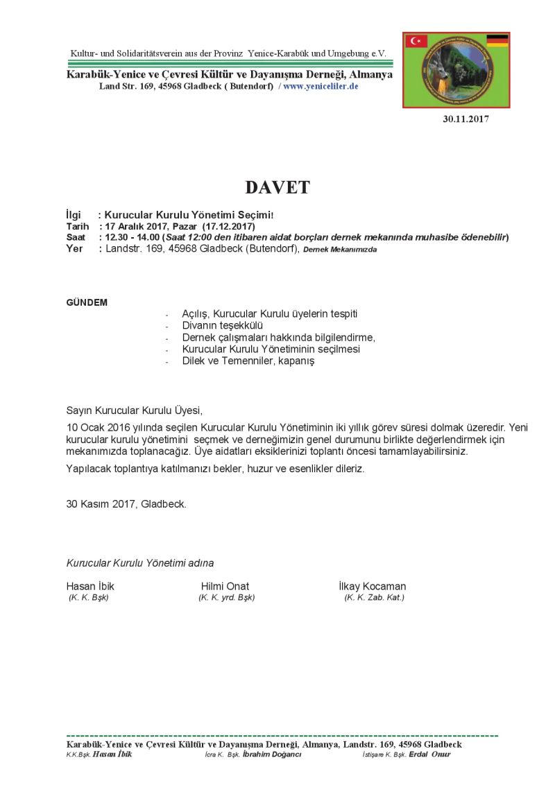 Karabük-Yenice ve Çevresi Kültür ve Dayanışma Derneği’nin Kurucular Kurulu Üyeleri, 17 Aralık 2017 pazar günü, Almanya Gladbeck’teki kendi dernek mekanında biraraya geldi.
