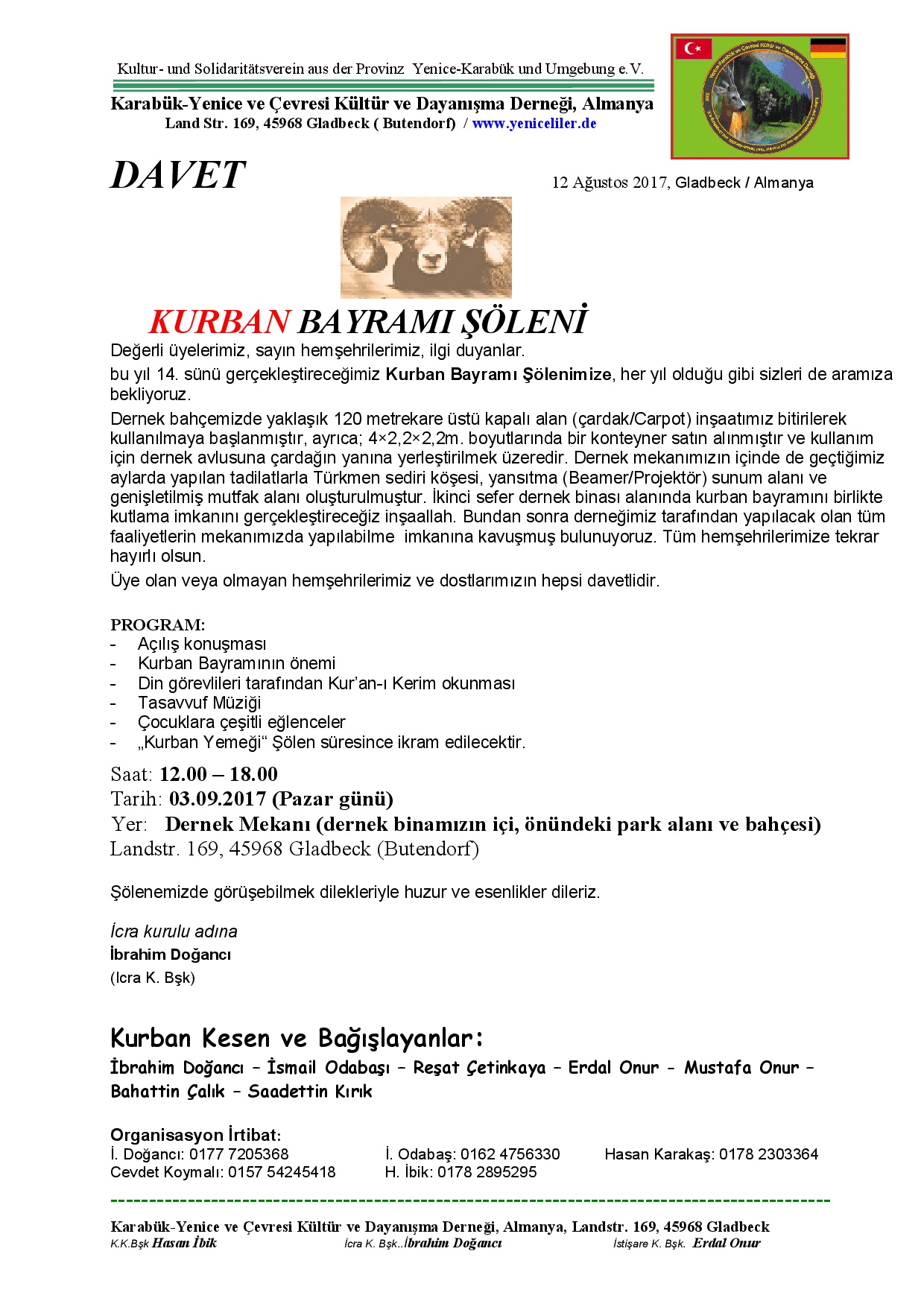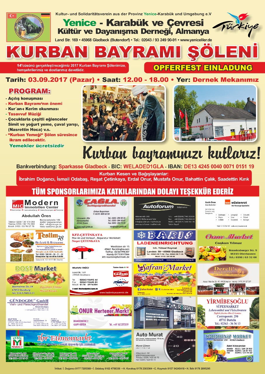 Dernek tarafından kesintisiz şekilde bu yıl ondördüncüsü düzenlenen kurban bayramı şölenine genç, yaşlı, özellikle Yenice, Karabük ve çevresinden olanlarla dost ve tanıdıklar, yerel ve yöresel dernek ve sivil toplum idarecileri katılarak bayramlaşma imkanı buldular. Şölende Almanya’da bugüne kadar vefat eden hemşehriler anılarak kaside, ilahi ve kur‘an okundu, topluca dua edildi. Çocuklarin tamamına kitap ve oyuncak hediye edildi.