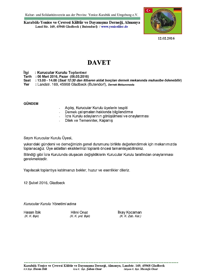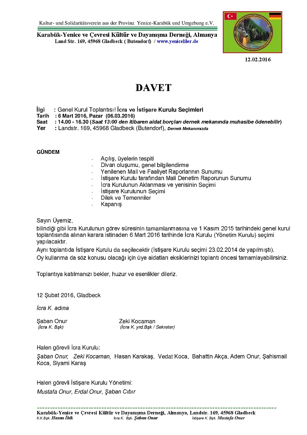6 Mart 2016 pazar günü saat 14:00 - 16:30 arası Almanya`nın Gladbeck şehrindeki dernek lokalinde Yenice-Karabük ve Çevresi Kültür ve Dayanışma Derneği`nin olağan Genel Kurul toplantısı ve İstişare (Danışma/Denetim) Kurulu seçimleri gerçekleştirildi.