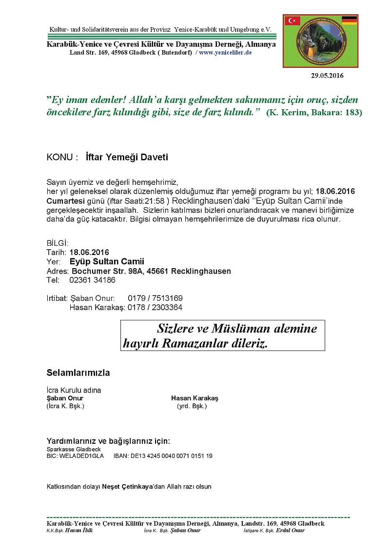 Almanya Karabük-Yenice ve Çevresi Kültür ve Dayanışma Derneği bu yıl da Almanya'da yaşayan hemşehrilerimizin iftarda biraraya gelmelerine vesile oldu. Bu yıl İftar yemeğinin düzenlendiği yerin farklı olmasına rağmen katılım yine yoğundu. 18.06.2016 da Recklinghausen’daki Eyüp Sultan Camii’de işadamı Neşet Çetinkaya’nın da katkısıyla derneğimiz adına verilen verilen iftar yemeğine, Almanyada'ki Karabük-Yeniceliler Derneği idarecileri ve üyeleri, Batı Karadeniz bölgesi derneklerinin yöneticileri (Zonguldak, Bartın, Çaycuma), diğer STK-Temsilcileri, Cami yöneticileri ve din görevlileri, Karabük , Yenice, Bartın ve Zonguldaklı hemşehrimiz katıldılar.