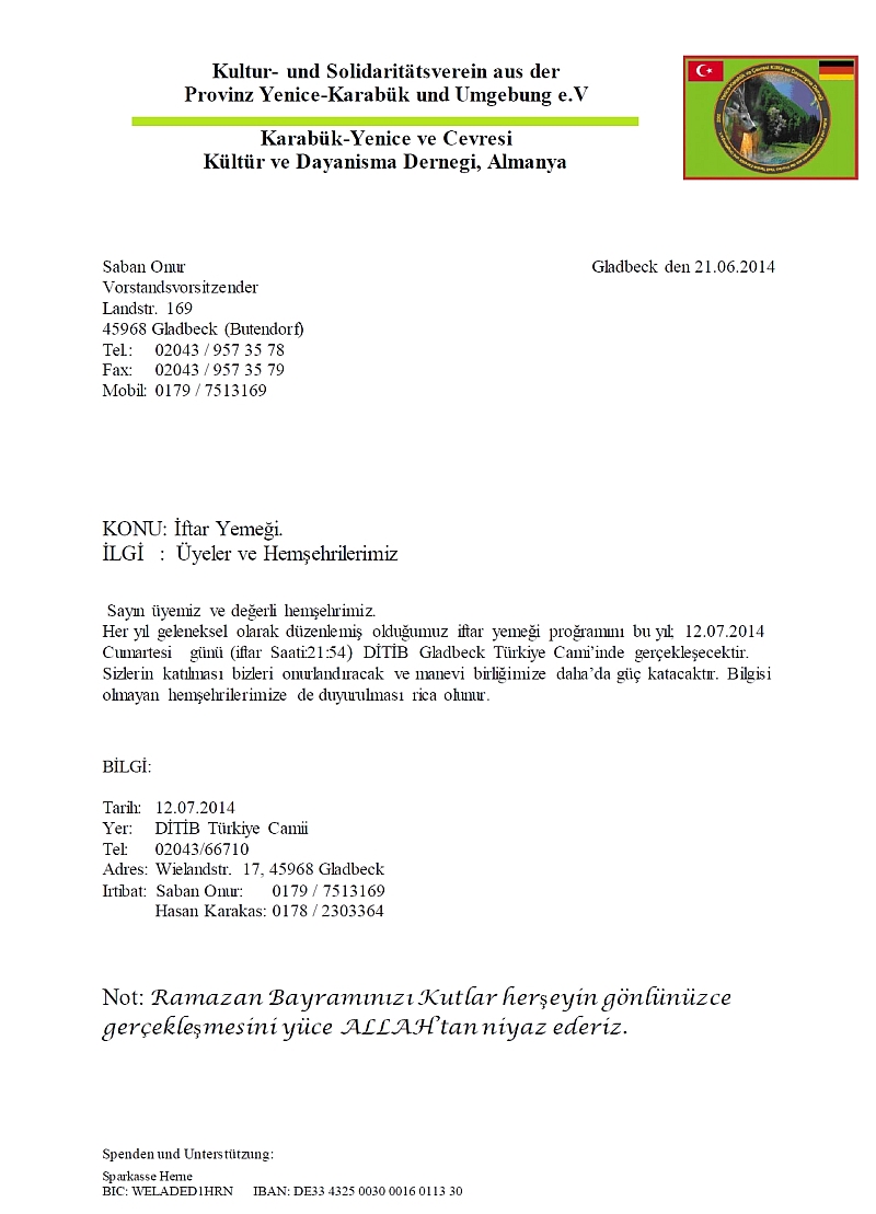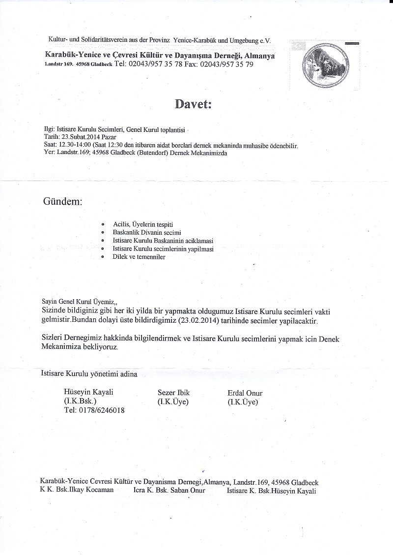 23 Şubat 2014 pazar günü saat 14:00 - 15:30 arası Almanya`nın Gladbeck şehrindeki dernek lokalinde Yenice-Karabük ve Çevresi Kültür ve Dayanışma Derneği`nin olağan Genel Kurul Toplantısı ve İstişare (Danışma/Denetim) Kurulu seçimleri gerçekleştirildi.