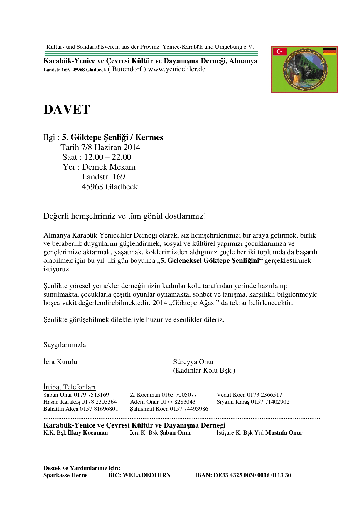 7-8 Haziran 2014 cumartesi ve pazar günü Almanya'nın Gladbeck kentinde, Karabük-Yeniceliler Derneğinin 5. Göktepe Yaylası Şenliği geniş katılımla gerçekleşti.