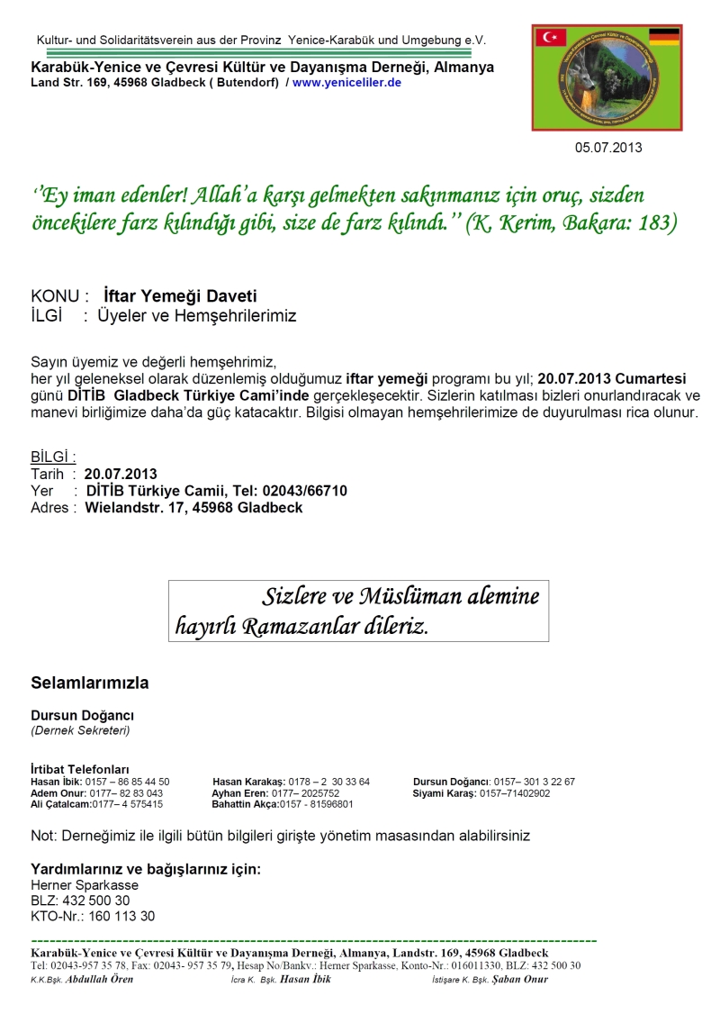 Almanya Karabük-Yenice ve Çevresi Kültür ve Dayanışma Derneği bu yıl da Almanya'da yaşayan hemşehrilerimizin iftarda biraraya gelmelerine vesile oldu. İzin dönemi olmasına rağmen katılım yine yoğundu. Gladbeck DİTİB Türkiye Camii'nde 20.07.2013 de verilen iftar yemeğine, Almanyada'ki Karabük-Yeniceliler Derneği idarecileri ve üyeleri, Batı Karadeniz bölgesi derneklerinin yöneticileri (Zonguldak, Bartın), Gladbeck Türkiye Camii yöneticileri ve din görevlileri, Karabük , Yenice, Bartın ve Zonguldaklı hemşehrimiz katıldılar.