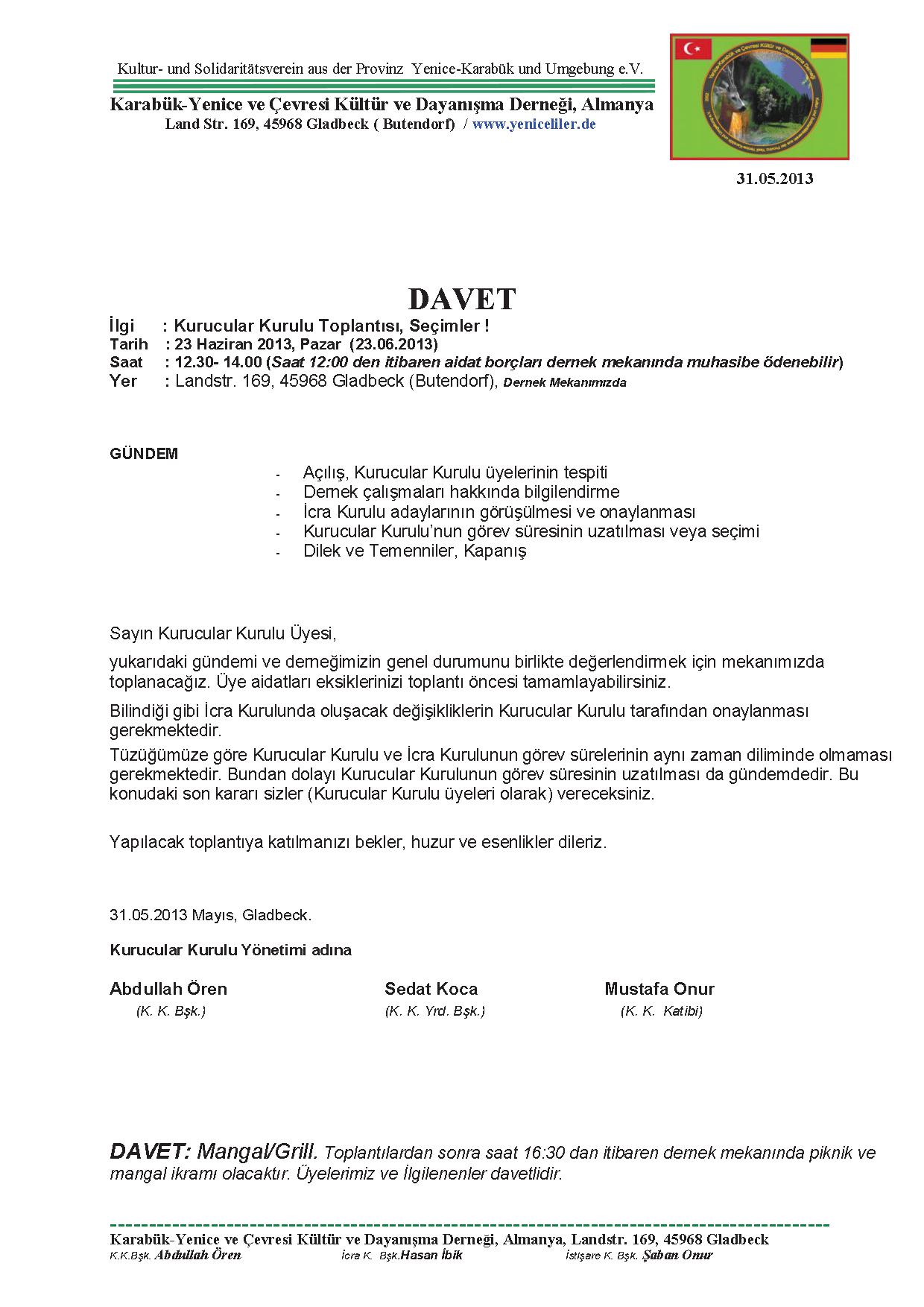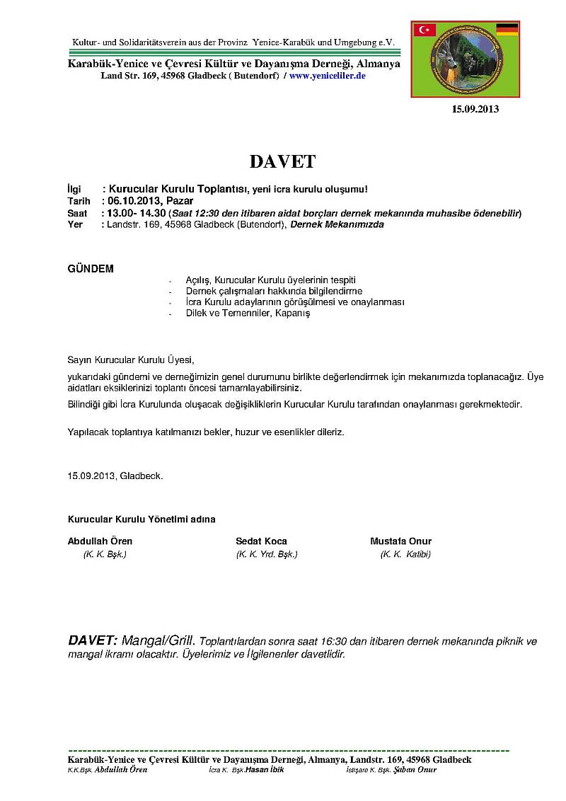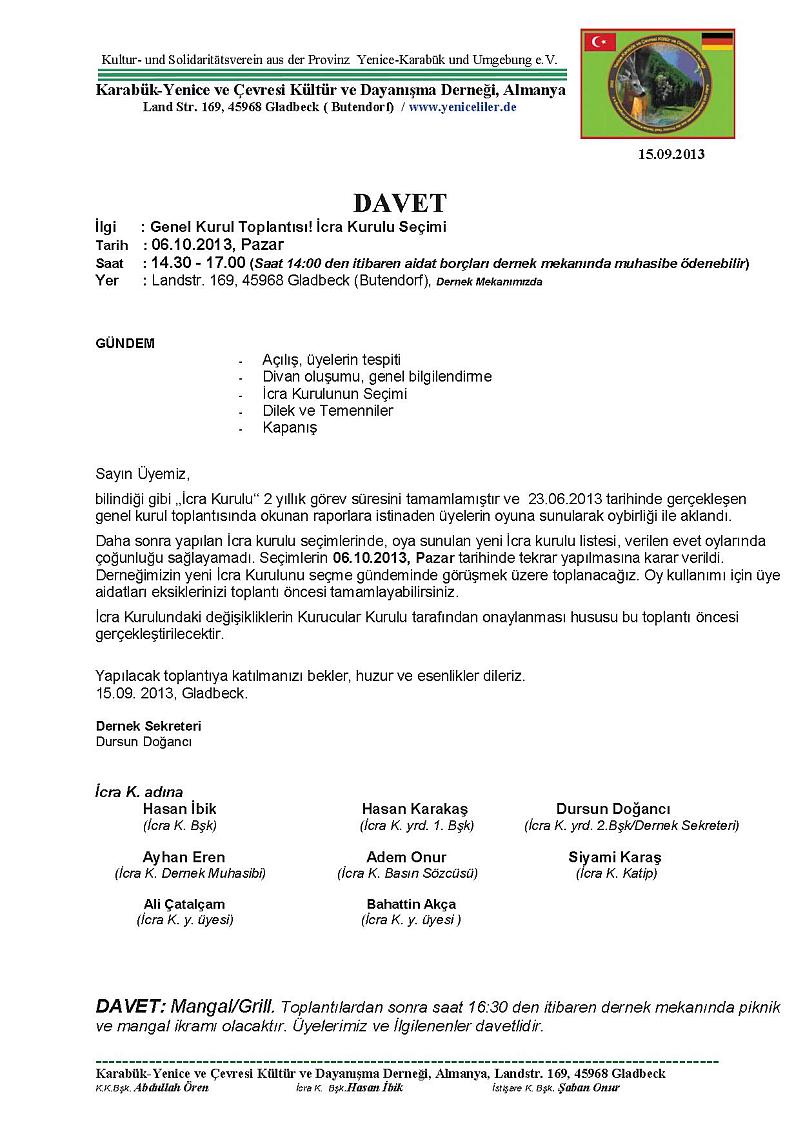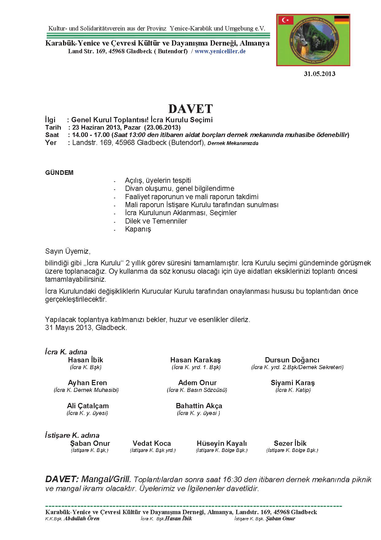 23 Haziran 2013 pazar günü saat 15:00 - 17:00 arası Almanya`nın Gladbeck şehrindeki dernek lokalinde Yenice-Karabük ve Çevresi Kültür ve Dayanışma Derneği`nin olağan İcra (Yönetim) Kurulu seçimleri gerçekleştirildi