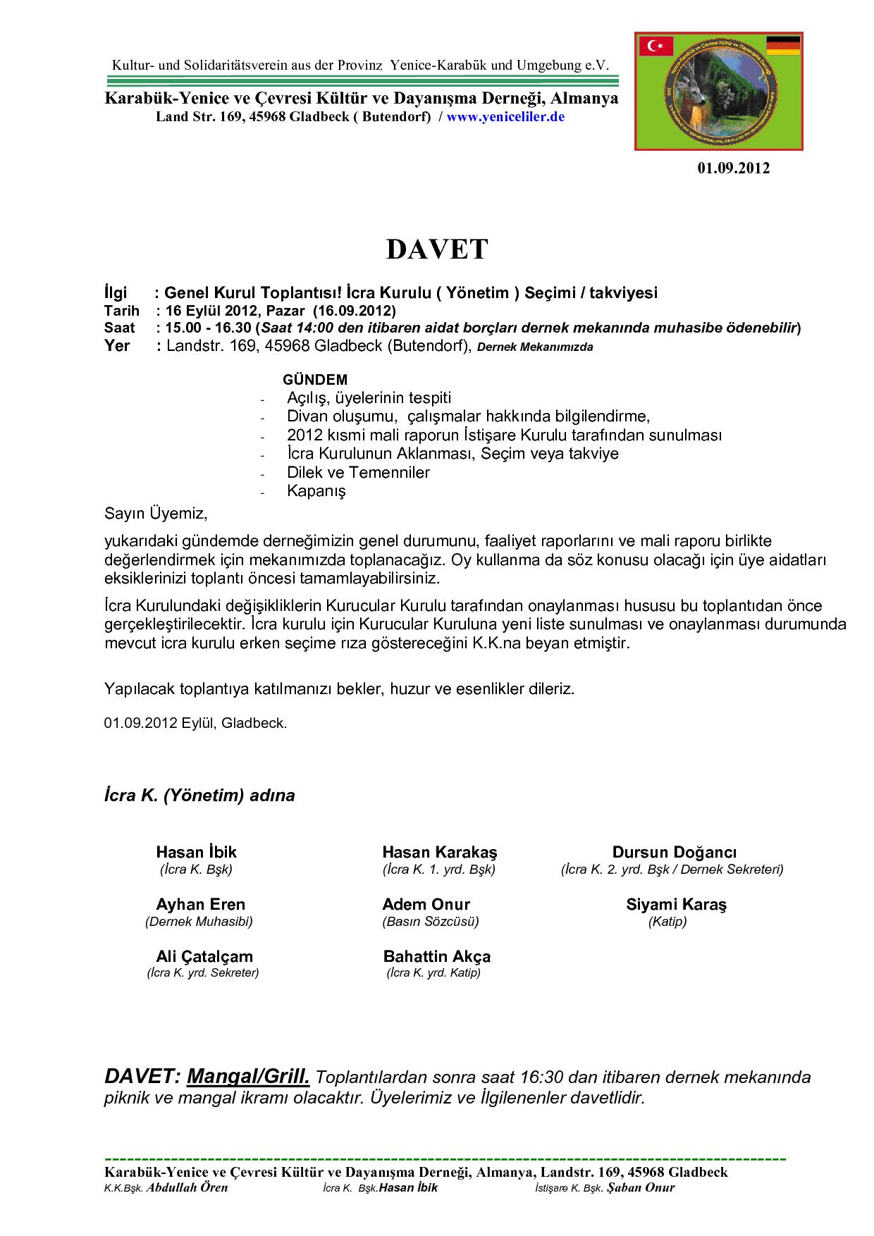 16 Eylül 2012 Pazar günü saat 13:30 - 16:30 arası Almanya`nın Gladbeck Şehrindeki Dernek Lokalinde Yenice-Karabük ve Çevresi Kültür ve Dayanışma Derneği`nin olağan Kurucular Kurulu ve Genel Kurul Toplantıları gerçekleştirildi