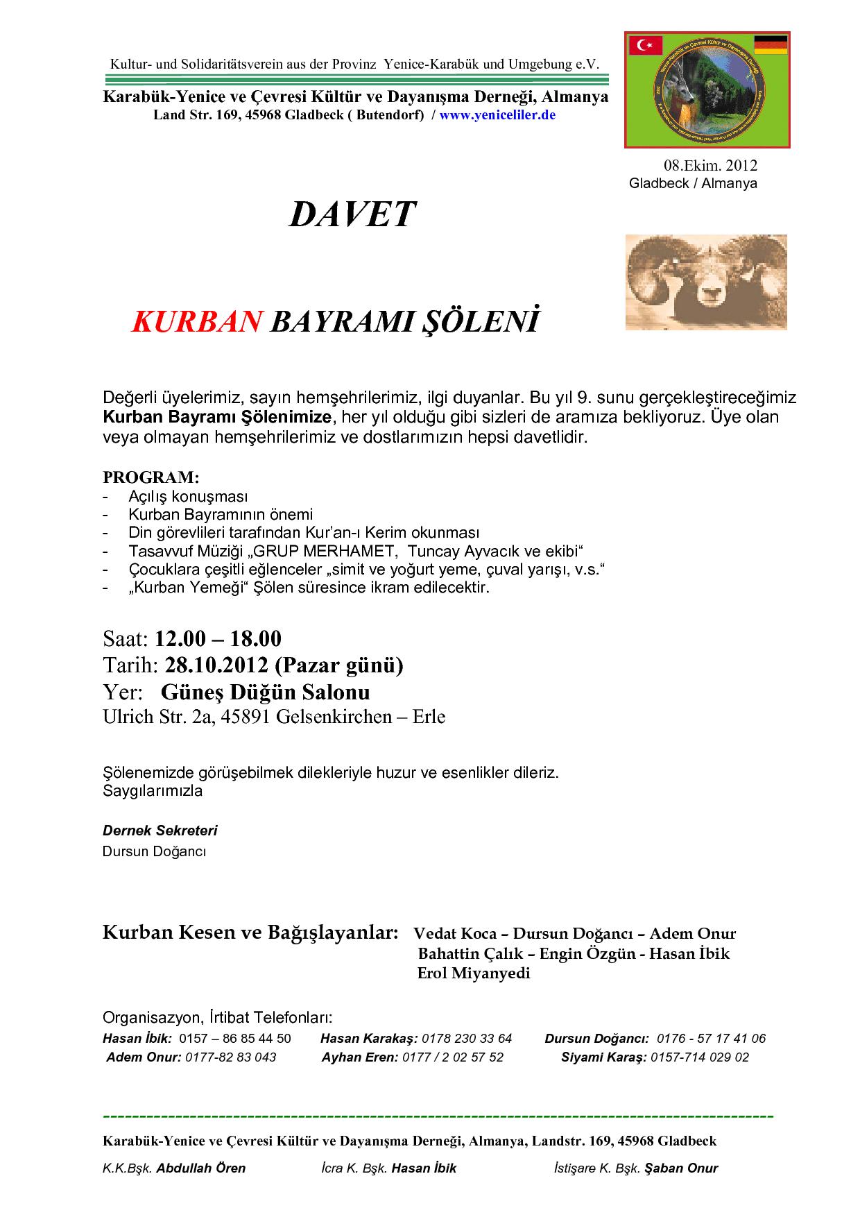 Geleneksel olarak dernek tarafından her yıl düzenlenen kurban bayramı şölenine (Gelsenkirchen Güneş Düğün Salonu’nda) 7’den 70’e özellikle Yenice, Karabük ve çevresinden olanlarla dost ve tanıdıklar katılarak bayramlaşma imkanı buldular. Şölende Almanya’da bugüne kadar vefat eden hemşehriler anılarak kaside ve kur‘an okundu, topluca dua edildi. Çocuklara çeşitli oyun ve eğlenceler, Tasavvuf Müzigi, Nasrettin Hoca ve Sema gösterisi sunuldu. Her yıl olduğu gibi Kurbanlarını derneğe bağışlayan Vedat Koca, Dursun Doğancı, Adem Onur, Bahattin Çalık, Engin Özgün, Hasan İbik ve Erol Miyanyedi’ye, yiyecek, içecek ve diğer masraflara katkı sağlayanlara teşekkür edildi.