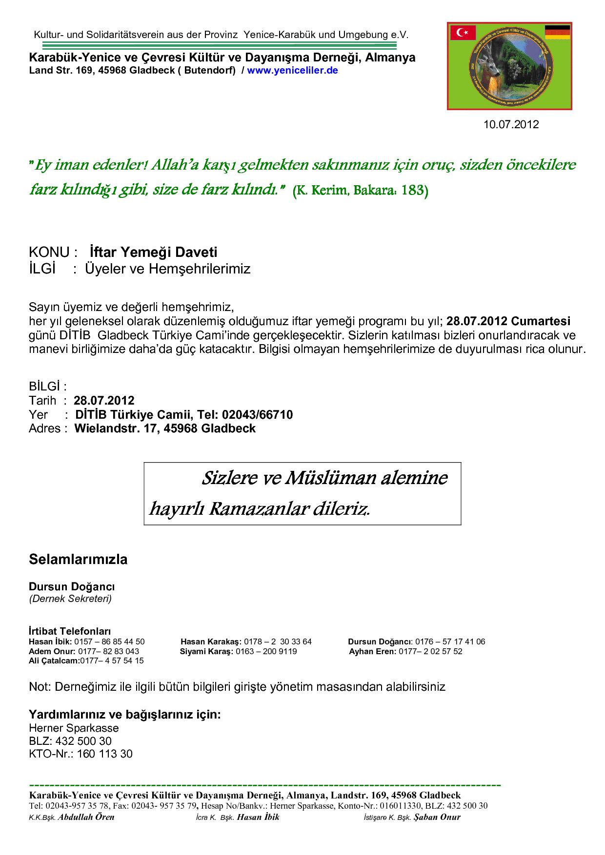 Almanya Karabük-Yenice ve Çevresi Kültür ve Dayanışma Derneği bu yıl da Almanya'da yaşayan hemşehrilerimizin iftarda biraraya gelmelerine vesile oldu. İzin dönemi olmasına rağmen katılım yine yoğundu. Gladbeck DİTİB Türkiye Camii'nde 28.07.2012 de verilen iftar yemeğine, Almanyada'ki Karabük-Yeniceliler Derneği idarecileri ve üyeleri, Batı Karadeniz bölgesi derneklerinin yöneticileri (Zonguldak, Bartın), Gladbeck Türkiye Camii yöneticileri ve din görevlileri, Karabük , Yenice, Bartın ve Zonguldaklı hemşehrimiz katıldılar.