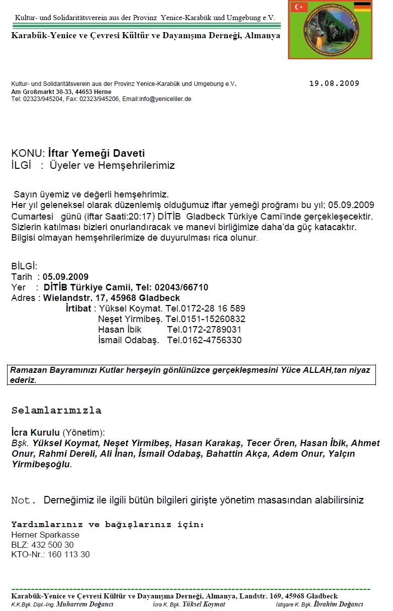 İstişare (Danışma) Kurulu bşk. İbrahim Doğancı: ''İstişare Kurulumuzun 05.06.2009 tarihinde Gladbeck“de yaptığı toplantıda, Karabük-Yenice ve Çevresi Kültür ve Dayanışma Derneğinin Haziran 2008 – Haziran 2009 yılı Muhasebe hesapları incelenmiştir. Kurulumuzun yaptığı gelir gider hesapları incelenmesinde, bu güne kadar yapılan gelir ve giderlerin, Dernek tüzüğümüzde belirtildiği şekilde olduğu tespit edilmiştir. Gelir ve Giderlerde herhangi bir usulsüzlüğe rastlanmamıştır. Mali ve faaliyet denetim raporunun dernek tüzüğüne uygunluğu tarafımızdan (İstişare Kurulu: Bşk. İbrahim Doğancı, üyeler: Siyami Karaş, Mustafa Onur, Hakkı Bağbaşı) teyit edilmistir'' dedi. Dernek adına da İcra kurulu başkan ve üyelerine (Gec. Bşk. Abdullah Ören, Yrd. Bşk. Saban Onur, Muhasip Ayhan Eren, Sekreter Hüseyin Kurt, Zabit Katibi Zeki Kocaman ile Ali İnan, Dursun Döngel, Satılmış Koymatlı, Halit Alaz, Muzaffer Çavuş, Sedat Koca, Metin Bağbaşı, Mehmet Topraklı) teşşekkürlerini belirterek, Mekan alımı işlemlerinin yürütülmesi hususunda özellikle Hüseyin Kurt'un gayret ve yardımlarına değindi.