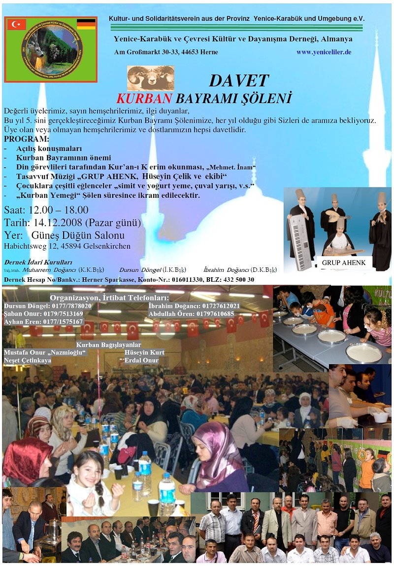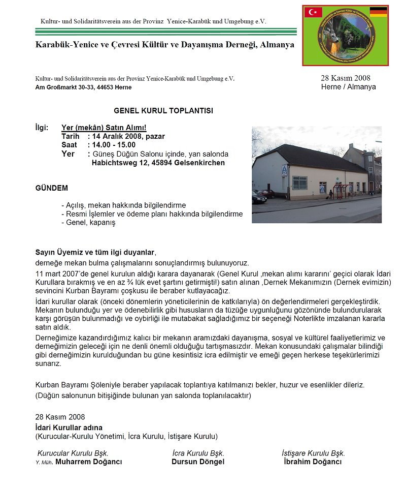 14 Aralık 2008 pazar günü Gelsenkirchen'de Dernek tarafından gerçekleştirilen Kurban Bayramı Şöleni sırasında Genel Kurul da toplandı. Almanya ''Karabük-Yenice ve Çevresi Kültür ve Dayanışma Derneği'' Genel Kurulu Mekan Alımı İşlemlerini oybirliği ile onayladı.