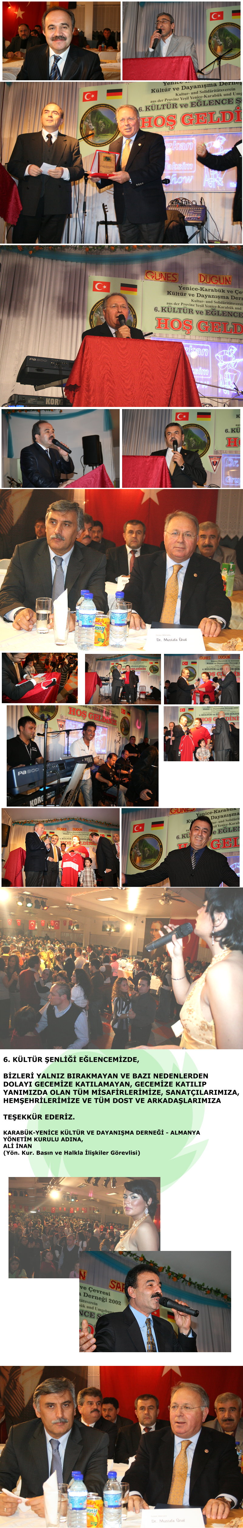 Ayrıca, Geleneksel olarak her yıl organize edilen, ve bu yıl 6.ncsı gerçekleştirilen, Karabük-Yenice Kültür ve Dayanışma Derneği '' 6. Kültür Şenliği'ne '' Davetli edilen, Türkiye'den ve Almanya yanısıra Avrupa'nın çeşitli ülkelerinden, geceye katılan ve bazı nedenlerden dolayı geceye katılamayacağını açıklayan '' tüm Misafirlere '' teşekkürlerini iletirken, geceye katılan '' tüm sanatçı arkadaşlara '' ve '' iş adamlarımıza '' ayrıca yönetim kurulu '' görevli arkadaşlara '' 6. Kültür şenliğinde gösterdikleri çaba ve hizmetten dolayı memnuniyetlerini iletirken, teşekkürlerini belirttiler.