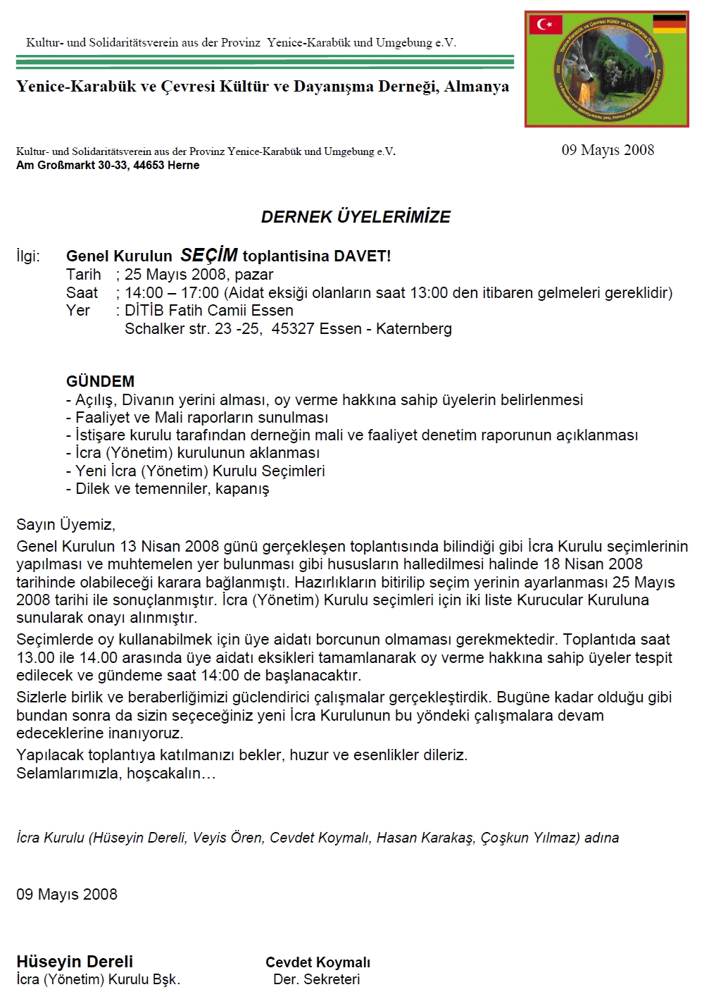 25 Mayıs 2008 Pazar günü saat 14:00 - 18:00 arası Almanya`nın Essen Şehrinde Yenice-Karabük ve Çevresi Kültür ve Dayanışma Derneği`nin erken yapılan İcra (Yönetim) Kurulu seçimleri gerçekleştirildi.