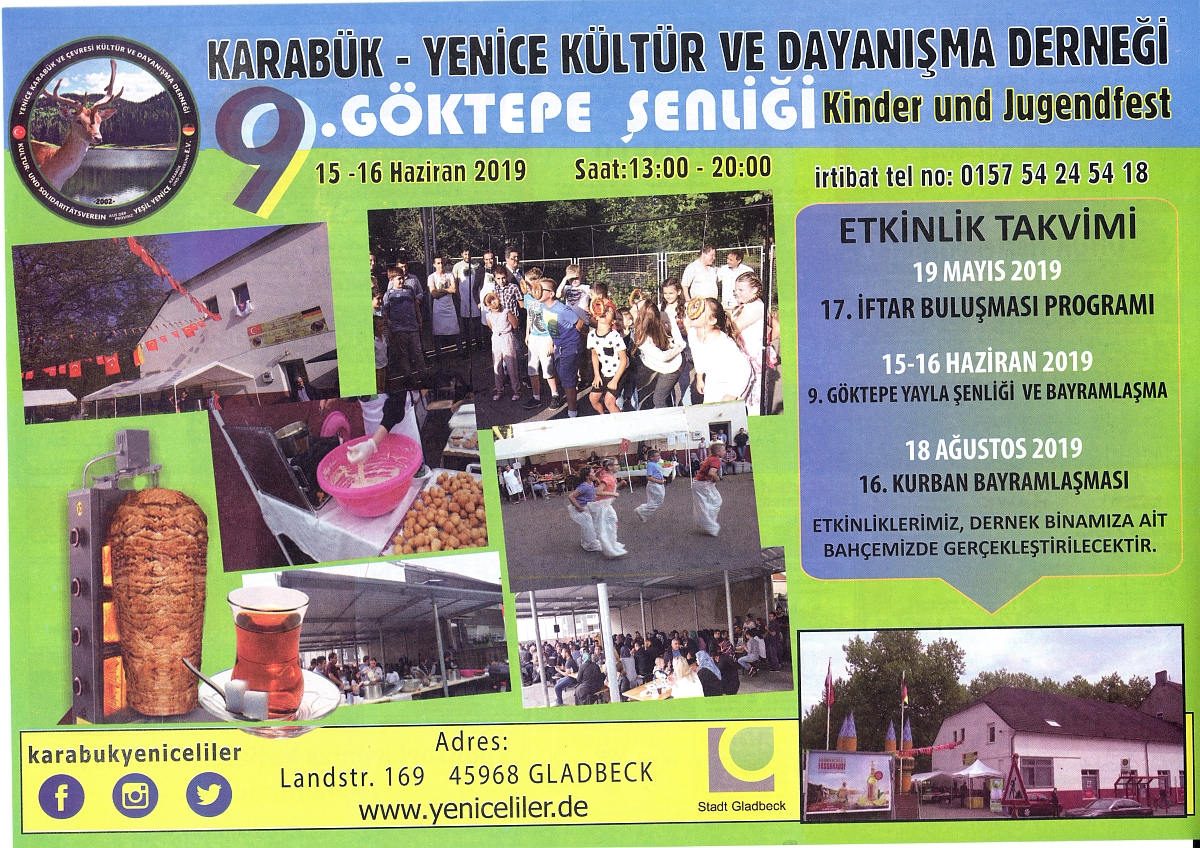 Almanya Karabük-Yenice ve Çevresi Kültür ve Dayanýţma Derneđi bu yýl da (19.05.2019 pazar) Almanya'da yaţayan hemţehrilerimizin iftarda biraraya gelmelerine vesile oldu. Bu yýl kendi dernek mekanýmýzda gerçekleţen etkinliđe katýlým yine yođundu. Ýftar yemeđine, Almanyada'ki Karabük-Yeniceliler Derneđinin yeni ve eski dönemlerinin idarecileri ve üyeleri, ilimizden ve Batý Karadeniz bölgesi derneklerinden yöneticiler(Zonguldak, Bartýn), diđer STK-Temsilcileri, sanatçýlar, basýn temsilcileri, Cami yöneticileri ve din görevlileri, Yenice, Karabük, Bartýn ve Zonguldaklý hemţehrimiz katýldýlar.